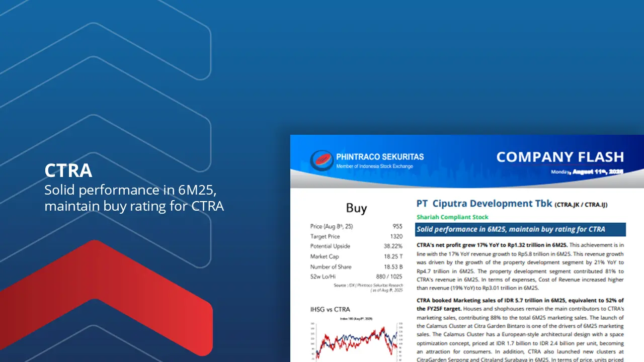 CTRA's net profit grew 17% YoY to Rp1.32 trillion in 6M25. This achievement is in line with the 17% YoY revenue growth to Rp5.8 trillion in 6M25. The property development segment contributed 81% to CTRA's revenue in 6M25.CTRA booked Marketing sales of IDR 5.7 trillion in 6M25, equivalent to 52% of the FY25F target. Houses and shophouses remain the main contributors to CTRA's marketing sales, contributing 88% to the total 6M25 marketing sales.In terms of price, units priced at IDR 2 billion to IDR 5 billion dominated 6M25 marketing sales, contributing 45% to the total. Meanwhile, VAT incentive contributed 33% to total 6M25 marketing sales.Therefore, with CTRA's achievements in 6M25, coupled with the BI rate cut and the extension of the DTP VAT incentive and Loan-to-Value (LTV) discount, we estimate CTRA can post profit growth of around 8% for FY25F.We maintain our buy rating for CTRA with the same fair value as in CTRA's previous company update of Rp1,320 (+38.22%).By PHINTRACO SEKURITAS | Research
