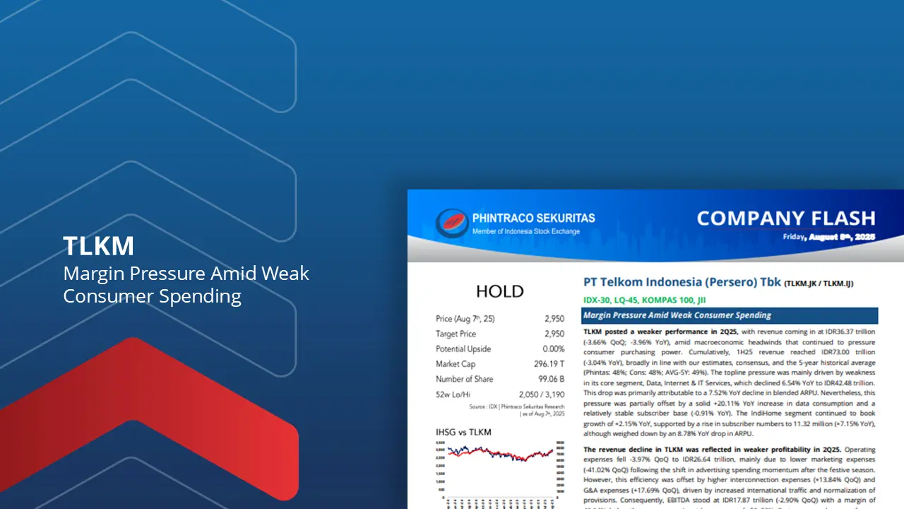 TLKM posted a weaker performance in 2Q25, with revenue coming in at IDR36.37 trillion (–3.66% QoQ; –3.96% YoY), amid macroeconomic headwinds that continued to pressure consumer purchasing power. Cumulatively, 1H25 revenue reached IDR73.00 trillion (–3.04% YoY), broadly in line with our estimates, consensus, and the 5-year historical average (Phintas: 48%; Cons: 48%; 5Y Avg: 49%). The topline pressure was mainly driven by weakness in its core segment, Data, Internet & IT Services, which declined 6.54% YoY to IDR42.48 trillion, primarily due to a 7.52% YoY drop in blended ARPU. This was partly offset by a solid +20.11% YoY growth in data consumption and a relatively stable subscriber base (–0.91% YoY). Meanwhile, IndiHome booked +2.15% YoY revenue growth, supported by subscriber growth to 11.32 million (+7.15% YoY), though weighed down by an 8.78% YoY ARPU decline.The revenue decline was mirrored in weaker profitability. Operating expenses fell –3.97% QoQ to IDR26.64 trillion, mainly from lower marketing costs (–41.02% QoQ) following the post-festive season shift in advertising spend. However, this was offset by higher interconnection expenses (+13.84% QoQ) and G&A expenses (+17.69% QoQ), driven by increased international traffic and normalization of provisions. Consequently, EBITDA fell to IDR17.87 trillion (–2.90% QoQ) with a margin of 49.14%, below management’s ~50–52% guidance. Additional cost pressure came from O&M expenses (+5.70% QoQ) due to network expansion, while personnel expenses declined –5.80% QoQ, reflecting benefits from last year’s early retirement program (ERP) and adjustments to employee tax expenses in the prior quarter. Net profit dropped to IDR5.17 trillion (–13.54% QoQ), with NPM at 14.20% (vs. 15.83% in 1Q25). Cumulatively, 1H25 net profit reached IDR10.98 trillion (–6.68% YoY), broadly in line with our and consensus estimates, but below the 5-year average (Phintas: 49%; Cons: 48%; 5Y Avg: 54%).Management revised down its FY25 guidance, with revenue growth now projected to be flat (vs. previous low single-digit growth expectation). The FY25 EBITDA margin target was also lowered to 50% (prev: 50–52%), reflecting expectations that consumer purchasing power will not improve significantly. A recovery in 2H25F is anticipated, supported by a total of 75 bps benchmark rate cuts by Bank Indonesia and government stimulus measures such as the Wage Subsidy Assistance (BSU), which may spur data consumption. Strategically, TLKM plans to spin off >50% of its fiber assets to Infranexia in 4Q25, which we view positively for utilization improvement and long-term value creation.We downgrade TLKM from BUY to HOLD following the achievement of our previous TP of IDR2,950, which implies an EV/EBITDA of 4.55×/4.33× for FY25F/FY26F. The main risk remains weak consumer purchasing power, which limits data traffic monetization potential despite ongoing efforts to boost margins through starter pack price adjustments and product simplification—the full impact of which may only be seen toward year-end. Upside risks: (1) faster monetization of fiber assets; (2) stronger-than-expected recovery in purchasing power driving better data traffic growth and yields.By PHINTRACO SEKURITAS | Research