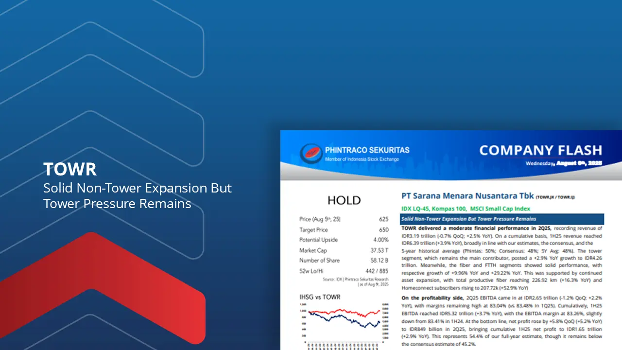 TOWR delivered a moderate performance in 2Q25, booking revenue of IDR3.19 trillion (-0.7% QoQ; +2.5% YoY), bringing 1H25 revenue to IDR6.39 trillion (+3.9% YoY). This figure was broadly in line with our estimate (50% Phintas), consensus (48%), and 5Y historical average (48%). The tower leasing business remained the core contributor, posting +2.9% YoY growth to IDR4.26 trillion. Meanwhile, the fiber and FTTH segments continued to show solid momentum, growing +9.96% YoY and +29.22% YoY respectively, supported by steady asset additions. Productive fiber reached 219.96k km (+14.36% YoY), and Homeconnect subscribers grew significantly to 207.72k (+52.85% YoY).Profitability remained resilient, with 2Q25 EBITDA recorded at IDR2.65 trillion (-1.2% QoQ; +2.2% YoY), maintaining strong margins at 83.04% (vs. 83.48% in 1Q25). On a cumulative basis, 1H25 EBITDA stood at IDR5.32 trillion (+3.7% YoY), with a margin of 83.26%, slightly lower than 1H24’s 83.41%. Net profit in 2Q25 rose +5.8% QoQ (+5.2% YoY) to IDR849 billion, resulting in 1H25 earnings of IDR1.65 trillion (+2.9% YoY), achieving 54.4% of our full-year forecast, although still below consensus (45.2%).Operationally, growth was visible on the asset side, with the number of towers rising +13.7% YoY to 35.83k units. However, tenant growth lagged at +7.1% YoY to 58.16k, leading to a decline in tenancy ratio to 1.62x (vs. 1.67x in 1H24). ARPT also softened by -3.9% YoY to IDR12.14 million, while fiber revenue/km fell -7.1% YoY to IDR683k—indicating margin pressure from tenant demand deceleration. On the positive side, non-tower expansion stayed strong: total FTTT pole length increased +20.72% YoY to 122.2k km, and Homeconnect subscribers jumped +52.9% YoY. However, a +47.2% YoY rise in home passes led to only a modest take-up rate improvement to 11.6% (vs. 11.2% in 1H24).We downgrade our recommendation from BUY to HOLD, with target price of IDR650. While results were broadly in line, we remain cautious on near-term growth, particularly with risks from operator consolidation (e.g., XL-FREN) that could drive prolonged site rationalization. On the flip side, TOWR completed a rights issue of IDR5.5 trillion to strengthen its subsidiary Protelindo’s balance sheet via debt repayment—a strategic move we view positively. Furthermore, management highlighted that the ISAT-Hutch rationalization is entering its final phase, potentially supporting new tower demand ahead.Downside Risks: 1) Prolonged decline in tenancy ratio due to further rationalization, 2) Margin pressure from aggressive pricing in FTTH and fiber services.By PHINTRACO SEKURITAS | Research