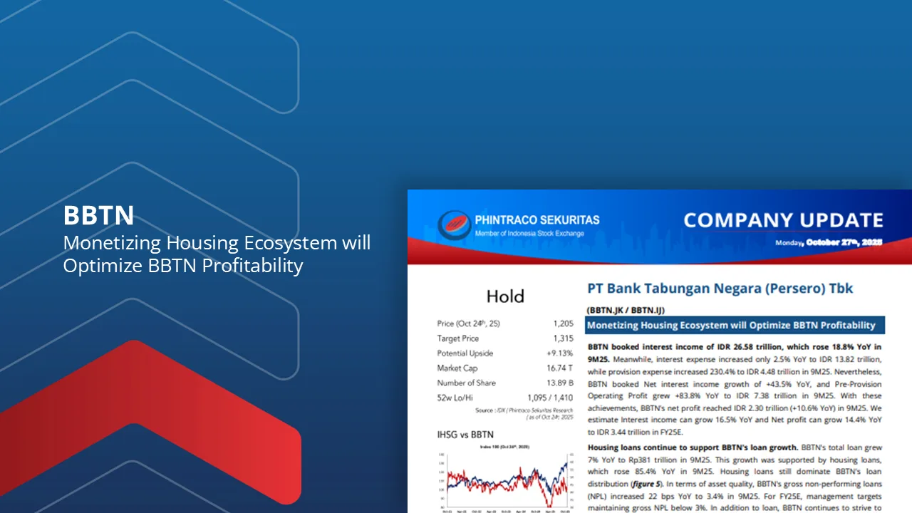 BBTN booked interest income of IDR 26.58 trillion, which rose 18.8% YoY in 9M25. Meanwhile, interest expense increased only 2.5% YoY to IDR 13.82 trillion, while provision expense increased 230.4%...