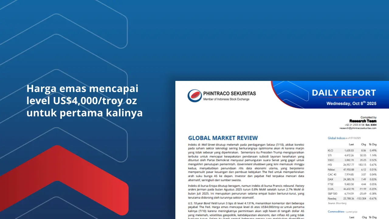 Indeks di Wall Street ditutup melemah pada Selasa (7/10).Saham sektor teknologi melemah seiring berkurangnya optimisme akan AI karena marjin yang tidak sebesar yang diperkirakan.Presiden Trump mengisyaratkan terbuka untuk mencapai kesepakatan pendanaan subsidi layanan kesehatan yang dituntut oleh Partai Demokrat.Indeks di bursa Eropa ditutup beragam, namun indeks di bursa Prancis rebound (7/10).Data cadangan devisa Indonesia pada September 2025 turun menjadi USD148.7 miliar dari USD150.7 miliar di Agustus 2025 (7/10).Indeks Keyakinan Konsumen bulan September 2025 diperkirakan naik pada level 120 dari 117.2 di Agustus 2025 (8/10).U.S. 10-year Bond Yield turun 3 bps di level 4.131%.Harga emas mencapai level di atas US$4.000/troy oz untuk pertama kalinya (7/10) karena meningkatnya permintaan akan safe haven.Diperkirakan IHSG berpotensi melanjutkan penguatan menguji level tertinggi di 8217.Top picks (8/10) : INDF, ASSA, MDKA, BKSL dan PWON.By PHINTRACO SEKURITAS | Research
