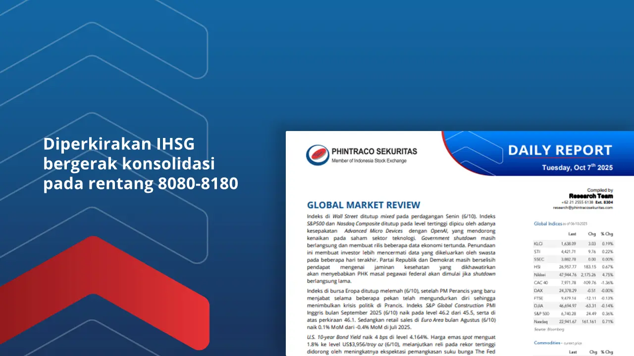 Indeks di Wall Street ditutup mixed pada Senin (6/10).Penguatan indeks S&P500 dan Nasdaq Composite dipicu oleh adanya kesepakatan Advanced Micro Devices dengan OpenAI, yang mendorong kenaikan pada saham sektor teknologi.Government shutdown masih berlangsung dan membuat rilis beberapa data ekonomi tertunda.Indeks di bursa Eropa ditutup melemah (6/10) akibat meningkatnya ketidakpastian politik di Prancis.Retail sales di Euro Area bulan Agustus (6/10) naik 0.1% MoM dari -0.4% MoM di Juli 2025.Data cadangan devisa bulan September 2025 menurut perkiraan naik pada level USD159 miliar dari USD150.7 miliar di Agustus 2025 (7/10).U.S. 10-year Bond Yield naik 4 bps di level 4.164%.Harga emas spot menguat 1.8% ke level US$3,956/troy oz (6/10).IHSG diperkirakan bergerak konsolidasi pada rentang 8080-8180.Top picks (7/10) : BREN, TOBA, ARCI, PSAB dan CTRA.By PHINTRACO SEKURITAS | Research