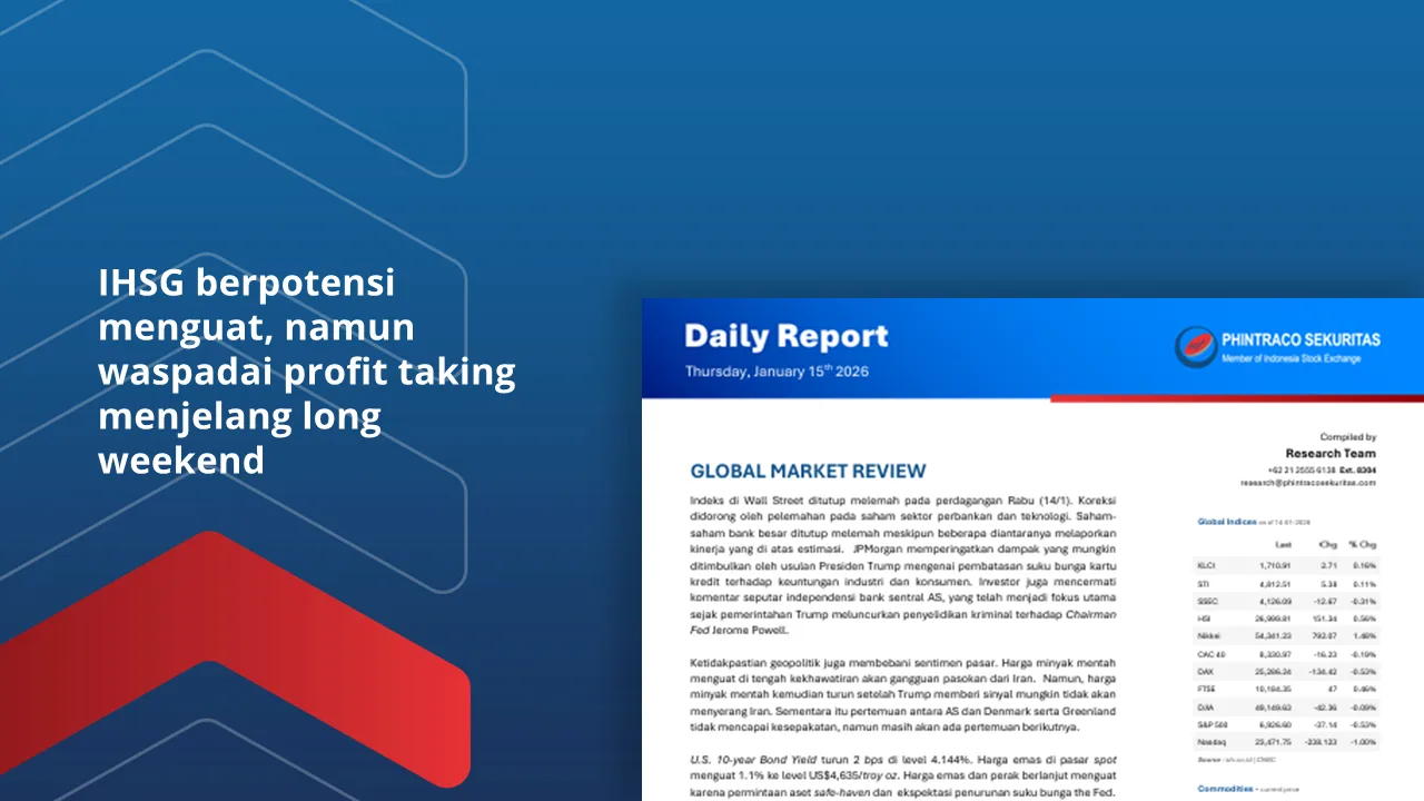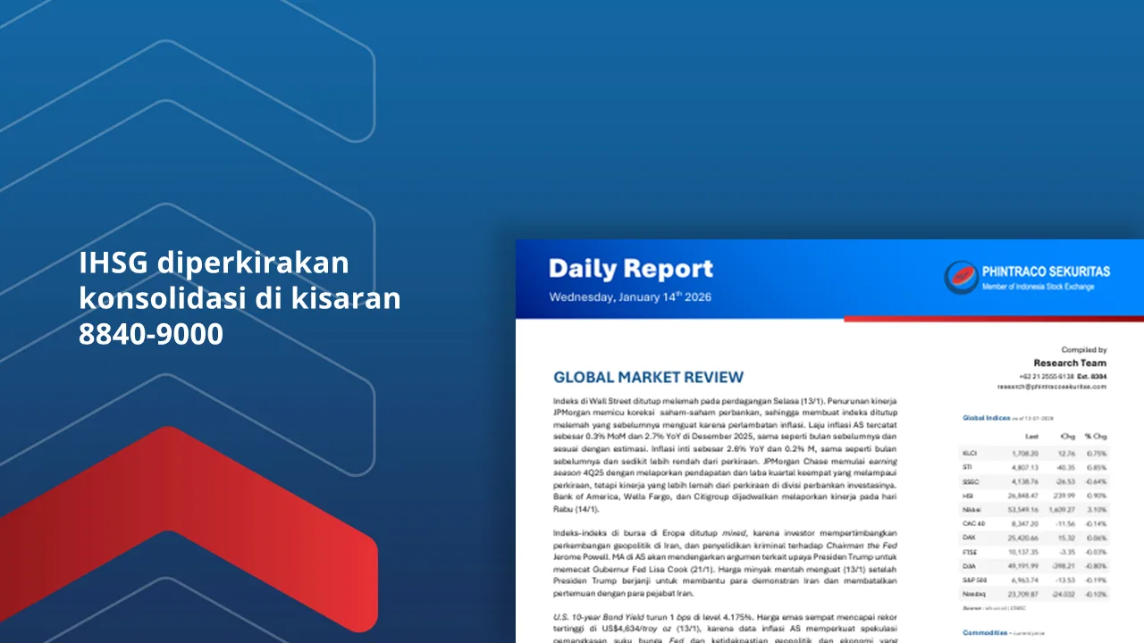 Indeks di Wall Street ditutup melemah pada Selasa (13/1). Penurunan kinerja JPMorgan memicu koreksi saham-saham perbankan. Laju inflasi AS sebesar 0.3% MoM dan 2.7% YoY di Desember 2025, sama seperti...