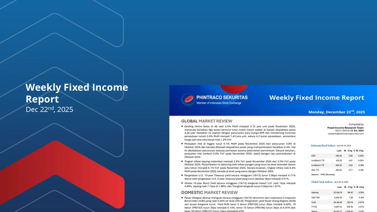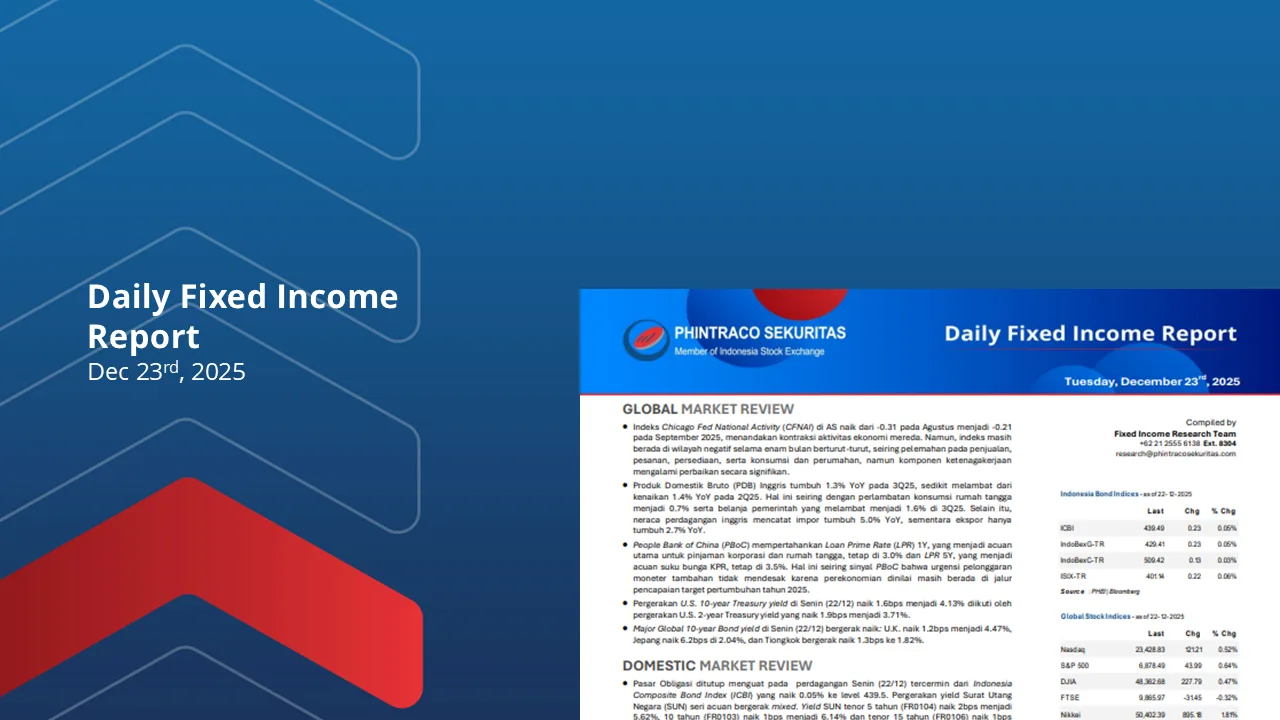 Indeks PMI manufaktur AS dari S&P Global turun ke 52 pada September 2025, didorong oleh melambatnya pesanan baru akibat tarif dan permintaan ekspor lemah, meskipun kepercayaan bisnis dan penyerapan tenaga kerja meningkat. Disisi lain, Indeks ISM naik tipis ke 49.1 namun masih kontraksi selama tujuh bulan berturut-turut, dengan produksi naik dan tekanan biaya tetap tinggi akibat tarif dan lemahnya permintaan.Inflasi Indonesia meningkat menjadi 2.65% YoY di September 2025 dari 2.31% YoY di Agustus, tertinggi sejak Mei 2024, terutama ditopang oleh kenaikan harga pangan sebesar 5.01% YoY. Inflasi inti juga naik tipis menjadi 2.19% YoY, sementara inflasi bulanan meningkat 0.21% MoM, melampaui ekspektasi pasar yang 0.13% MoM. Disisi lain, indeks PMI Manufaktur Indonesia turun menjadi 50.4 pada September 2025 dari 51.5 di Agustus, namun masih menunjukkan ekspansi aktivitas pabrik untuk dua bulan berturut-turut. Pesanan baru terus naik, sementara hasil produksi menurun akibat lemahnya daya beli pelanggan.