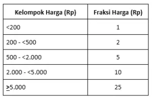 - Fraksi harga Rp2 terdiri dari kelompok harga saham dari Rp200 – <Rp500 per lembar saham.