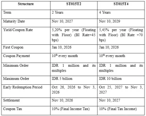 ST015-T2 has a 2-year tenor with a floating coupon with a minimum floor of 5.20% per year (BI Rate+45 bps).