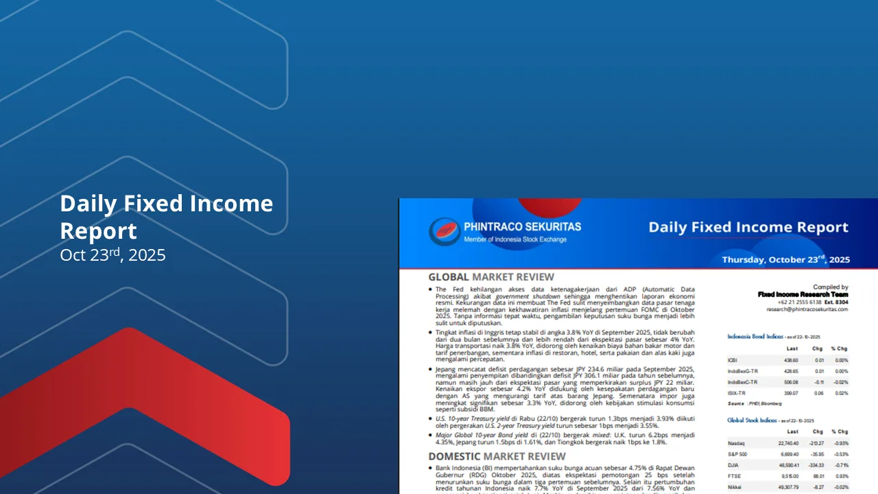 Bank Indonesia (BI) mempertahankan suku bunga acuan sebesar 4.75% di Rapat Dewan Gubernur (RDG) Oktober 2025, diatas ekspektasi pemotongan 25 bps setelah menurunkan suku bunga dalam tiga pertemuan sebelumnya. Selain itu pertumbuhan kredit tahunan Indonesia naik 7.7% YoY di September 2025 dari 7.56% YoY dan mencapai level tertinggi sejak Juni. Meskipun demikian, permintaan kredit masih lesu akibat sikap menunggu di kalangan pelaku usaha dan tingginya suku bunga pinjaman.