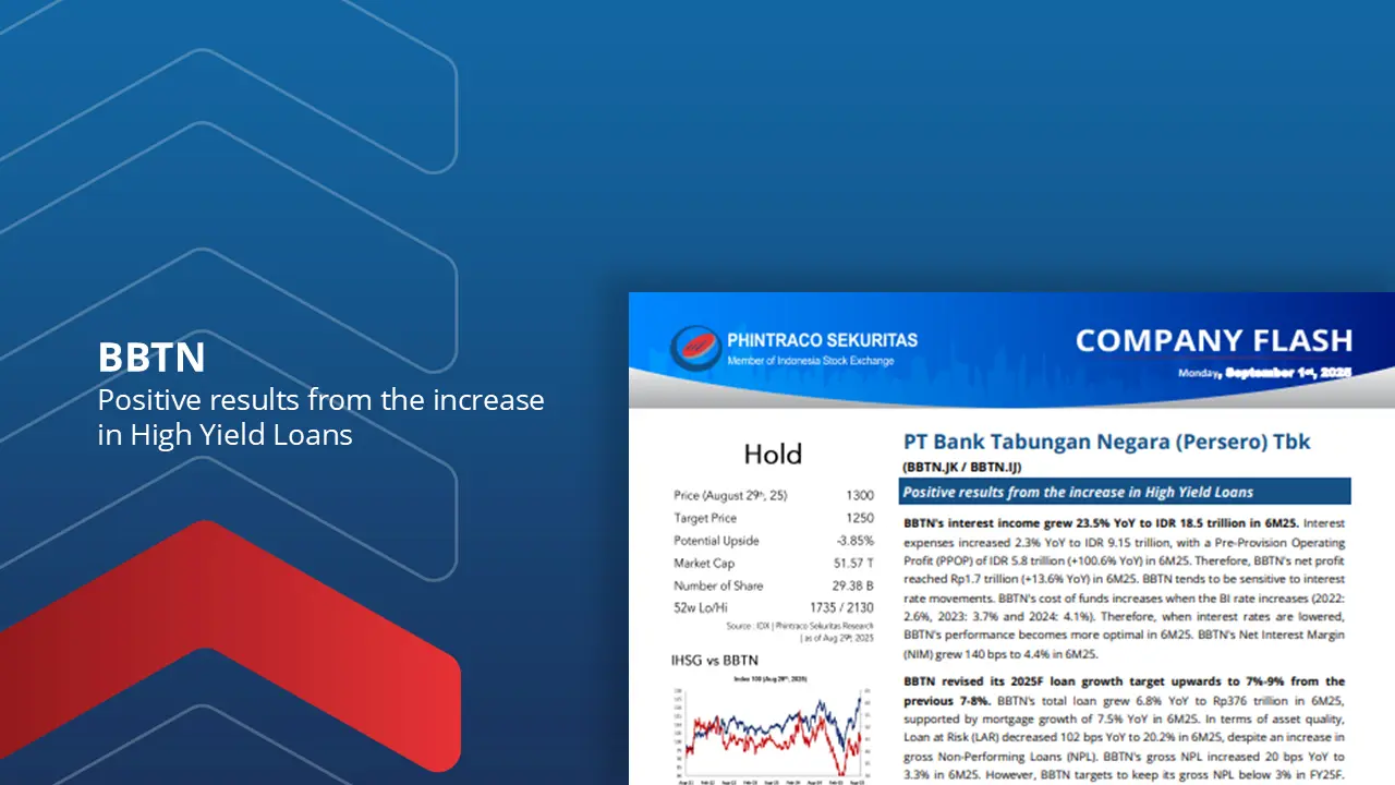 BBTN's interest income grew 23.5% YoY to IDR 18.5 trillion in 6M25. Interest expenses increased 2.3% YoY to IDR 9.15 trillion, with a Pre-Provision Operating Profit (PPOP) of IDR 5.8 trillion (+100.6% YoY) in 6M25.Therefore, when interest rates are lowered, BBTN's performance becomes more optimal in 6M25. BBTN's Net Interest Margin (NIM) grew 140 bps to 4.4% in 6M25.BBTN revised its 2025F loan growth target upwards to 7%-9% from the previous 7-8%. BBTN's total loan grew 6.8% YoY to Rp376 trillion in 6M25, supported by mortgage growth of 7.5% YoY in 6M25.BBTN's liquidity improved in 6M25, with the Loan to Deposit Ratio (LDR) decreasing 380 bps YoY to 92.6% in 6M25. Maintained liquidity conditions can improve BBTN's ability to disburse loan.Current Account Savings Account (CASA) grew 5.6% YoY to IDR 199.7 trillion in 6M25. Furthermore, BBTN booked total Third Party Funds of IDR 406 trillion (+11.2% YoY) in 6M25.The significant growth in CASA represents an effort to mitigate the negative impact of high interest rates on the cost of funds.Maintained liquidity and the potential recovery of the property sector in 2H25, we estimate BBTN can record interest income growth of 9% YoY for 2025F.With BBTN's performance in line with our estimates, we maintain projection from the previous BBTN Company Update, with a fair value of Rp 1,250.By PHINTRACO SEKURITAS | Research - Disclaimer On -
