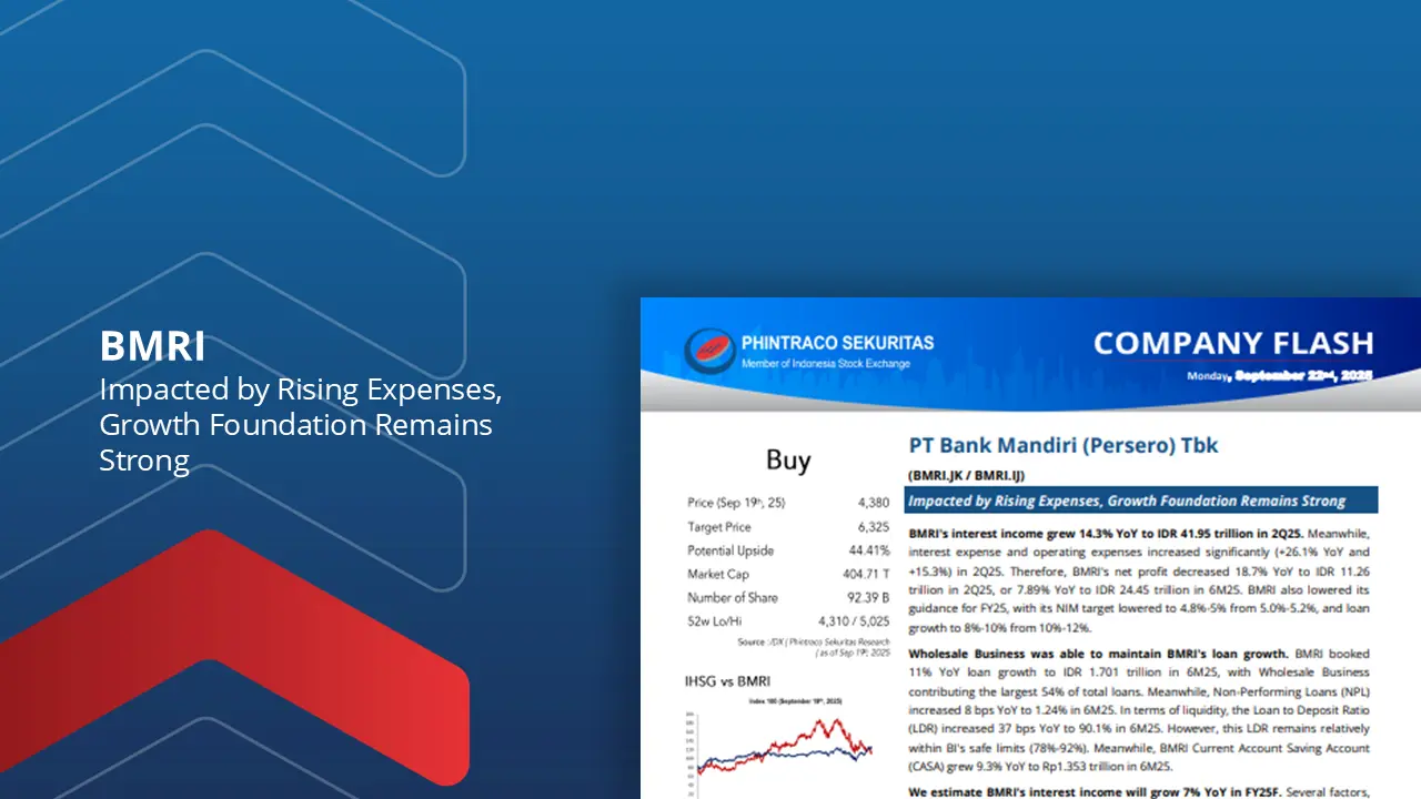 BMRI's interest income grew 14.3% YoY to Rp41.95 trillion in 2Q25. Meanwhile, interest expense and operating expenses increased significantly (+26.1% YoY and +15.3%) in 2Q25.BMRI also lowered its guidance for FY25, with its NIM target lowered to 4.8%-5% from 5.0%-5.2%, and loan growth to 8%-10% from 10%-12%.Wholesale Business was able to maintain BMRI's loan growth. BMRI booked 11% YoY loan growth to Rp1.701 trillion in 6M25, with Wholesale Business contributing the largest 54% of total loans.We estimate BMRI's interest income will grow 7% YoY in FY25F. Several factors, such as improving domestic consumption, downstreaming, and the government's allocation of IDR 55 trillion in funds, have the potential to support BMRI's loan growth.Other revenue optimization comes from non-interest income (NII), including the adaptation of Livin', which contributed an 11.9% YoY increase to BMRI's NII growth in 6M25.With the potential for BMRI's performance recovery, we maintain our Buy rating for BMRI, with the same projections and fair value as in our previous company update, at IDR 6,325.By PHINTRACO SEKURITAS | Research - Disclaimer On -