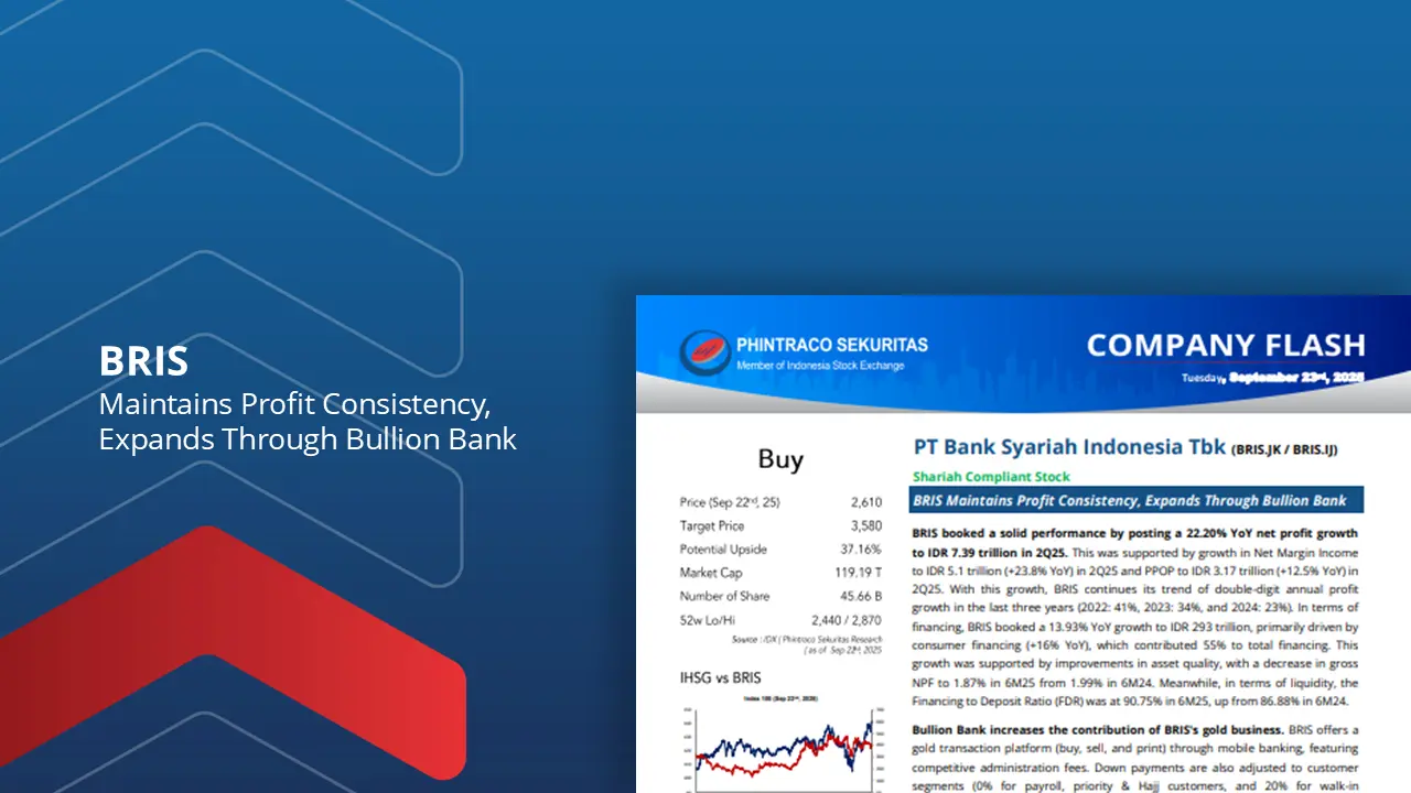 BRIS booked a solid performance by posting a 22.20% YoY net profit growth to IDR 7.39 trillion in 2Q25.This was supported by growth in Net Margin Income to IDR 5.1 trillion (+23.8% YoY) in 2Q25 and PPOP to IDR 3.17 trillion (+12.5% YoY) in 2Q25.In terms of financing, BRIS booked a 13.93% YoY growth to IDR 293 trillion, primarily driven by consumer financing (+16% YoY), which contributed 55% to total financing.Bullion Bank increases the contribution of BRIS's gold business. BRIS's gold business was able to record significant growth of +82% YoY to IDR 16.88 trillion in 6M25 with a contribution of 5% of total revenue in 6M25 vs. (FY21: 2%).Gold business provides high returns for BRIS with controlled costs (Blended Gold Yield 13.18% vs. Blended Gold CoC 0.02%).With BRIS's performance in line with our expectations, we maintain our Buy rating for BRIS with the same projection and fair value as in the previous BRIS company update, which was IDR 3,580.By PHINTRACO SEKURITAS | Research - Disclaimer On -