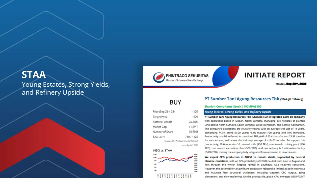STAA is a fully integrated palm oil company with 49k hectares of planted land across North & South Sumatra and Kalimantan. The plantation profile is relatively young, with an average tree age of 14 years—74.3% in prime stage (8–20 years), 9.4% mature (>20 years), and 10% immature. Productivity remains superior, with combined FFB yields of 23.41 tons/ha and 23.98 tons/ha for nucleus estates, above the industry average of ~19–20 tons/ha. Operations are supported by 10 palm oil mills (450 TPH), a kernel crushing plant (600 TPD), a solvent extraction plant (500 TPD), and a downstream refinery & fractionation facility (2,000 TPD), making STAA fully integrated from upstream to downstream.CPO production is expected to remain stable in 2H25F under neutral climatic conditions, with an 82% ENSO-neutral probability through August and 48% into winter, maintaining consistent rainfall in Southeast Asia. A major supply rebound appears limited, given structural headwinds in Indonesia and Malaysia such as stagnant output, aging trees, and slow replanting. On pricing, global CPO has averaged USD 972/MT as of mid-September, while price spreads have narrowed due to India’s restocking ahead of Diwali and lower import tariffs, offering modest price support.We project FY25E revenue of IDR 8.38 trillion (+30.1% YoY), underpinned by stronger volumes, improved ASP, and incremental downstream contribution from the refinery (olein ~IDR 4.43 trillion, stearin ~IDR 838 billion, RBDPO ~IDR 99 billion, PFAD ~IDR 205 billion). Gross profit is forecast at IDR 2.23 trillion (+1.98% YoY) with ~27% margin, initially weighed by external CPO purchases (IDR 1.12 trillion) and new plant ramp-up. Margins are expected to expand to 28–29% in FY26–FY27F as internal feedstock utilization improves. Net profit FY25E is estimated at IDR 1.33 trillion (+3.6% YoY) with a 16% net margin, rising to IDR 1.64 trillion (+23.7% YoY) and ~18–19% margin in FY26F–FY28F as downstream operations scale.We initiate coverage with a BUY recommendation and a target price of IDR 1,400/share, implying PER of 11.5x/9.3x and PBV of 2.5x/2.1x for FY25E/FY26F, using a DCF approach (WACC 11.5%; TG 2.5%). The stock currently trades at an EV/ha of IDR 299 million, above the industry average of IDR 162.9 million—reflecting its younger plantation profile, high productivity, low replanting needs, and growing downstream integration.We view STAA as attractive due to: (1) productive plantation age averaging 14 years, (2) core estate yields near 24 tons/ha, (3) new Riau refinery enhancing value capture, and (4) a healthy balance sheet with low leverage to support measured growth.Key downside risks include: (1) global CPO price volatility, (2) weather-related yield disruptions, (3) fertilizer price fluctuations, and (4) regulatory changes on biodiesel mandates or export taxes.By PHINTRACO SEKURITAS | Research –Disclaimer On–