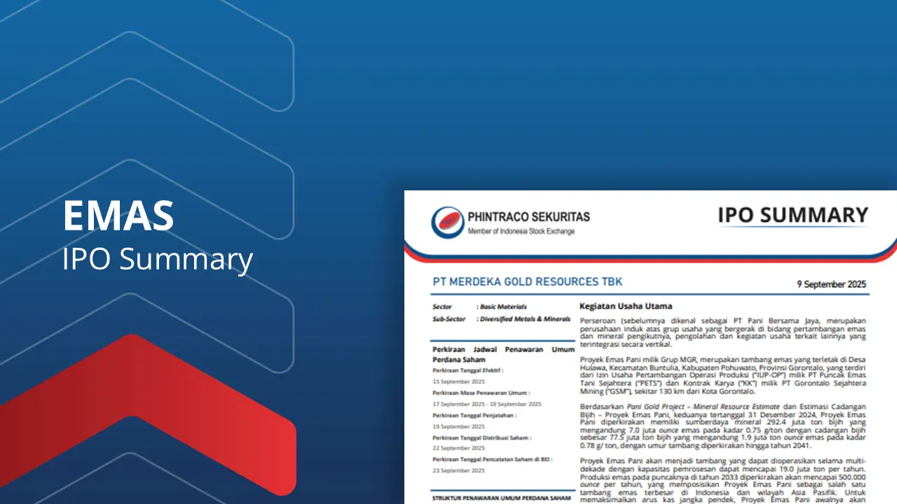 Code : EMAS Sector : Basic Materials Sub-Sector : Diversified Metals & Minerals--------------------------------------------- PERKIRAAN JADWAL PENAWARAN UMUM PERDANA SAHAMPerkiraan Tanggal Efektif : 15 September 2025Perkiraan Masa Penawaran Umum : 17 September 2025 - 19 September 2025Perkiraan Tanggal Penjatahan : 19 September 2025Perkiraan Tanggal Distribusi Saham : 22 September 2025Perkiraan Tanggal Pencatatan Saham di BEI : 23 September 2025--------------------------------------------- STRUKTUR PENAWARAN UMUM PERDANA SAHAMSebanyak-banyaknya 1.618.023.300 (satu miliar enam ratus delapan belas juta dua puluh tiga ribu tiga ratus) saham biasa atas nama, yang mewakili sebesar-besarnya 10,00% (sepuluh koma nol nol persen) dari modal ditempatkan dan disetor dalam Perseroan setelah Penawaran Umum Perdana Saham, yang dikeluarkan dari portepel Perseroan.Nilai Nominal : Rp150 per lembar sahamHarga Penawaran : Rp1800 - Rp3020 per lembar sahamJumlah Penawaran Umum : Sebanyak-banyaknya sebesar Rp4.886.430.366.000Penjamin Emisi : PT Trimegah Sekuritas Indonesia Tbk PT Sinarmas Sekuritas PT Indo Premier Sekuritas--------------------------------------------- Laporan dalam format PDF dapat diunduh pada menu "Research - IPO Summary" di www.phintracosekuritas.com dan telegram @phintasprofitsBy PHINTRACO SEKURITAS | Research - Disclaimer On -
