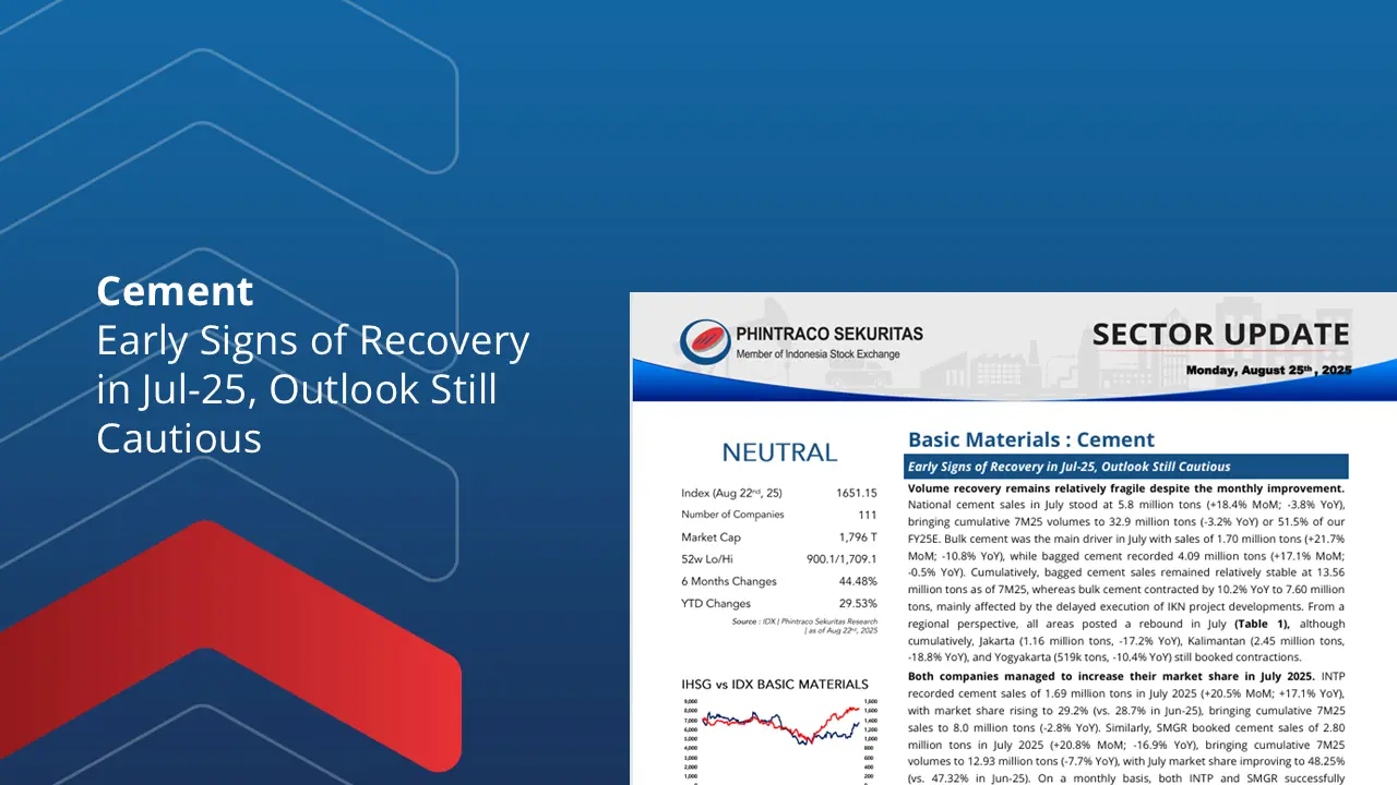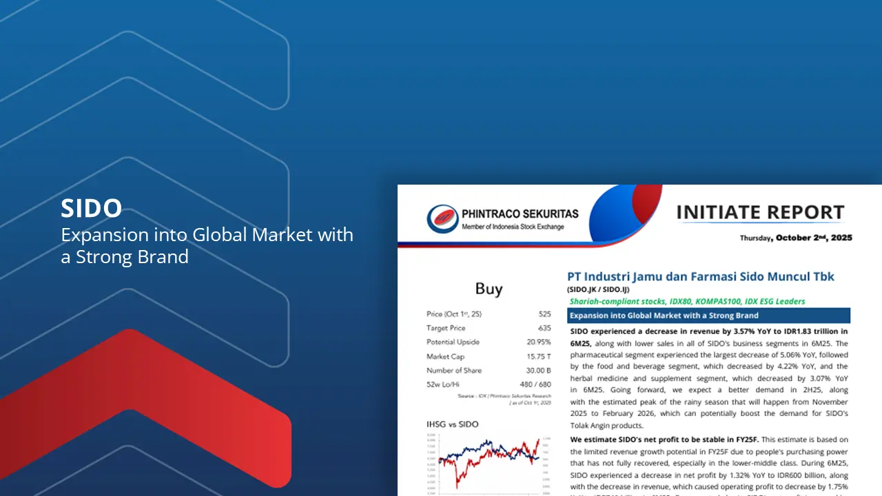 SIDO experienced a decrease in revenue by 3.57% YoY to IDR1.83 trillion in 6M25, along with lower sales in all of SIDO's business segments in 6M25. Going forward, we expect a better demand in 2H25, along with the estimated peak of the rainy season that will happen from November 2025 to February 2026, which can potentially boost the demand for SIDO's Tolak Angin products.We estimate SIDO's net profit to be stable in FY25F. This estimate is based on the limited revenue growth potential in FY25F due to people's purchasing power that has not fully recovered, especially in the lower-middle class. During 6M25, SIDO experienced a decrease in net profit by 1.32% YoY to IDR600 billion, along with the decrease in revenue, which caused operating profit to decrease by 1.75% YoY to IDR746 billion in 6M25.The chemical, pharmaceutical, and traditional medicine industries still have room to grow in the long term. This is based on the GDP trends of the chemical, pharmaceutical, and traditional medicine industries, which have continued to recover after Covid-19. In addition, manufacturing activity in this industry remains in an expansive zone in 2Q25 and has tended to stabilize over the past year.SIDO is the market leader for common cold products, with the Tolak Angin brand. In addition, SIDO's Tolak Angin and Kuku Bima Ener-G! products have successfully penetrated the global market. This indicates that SIDO's products are not only well-received in the domestic market but also able to compete globally, which is expected to drive long-term growth.We give a Buy recommendation for SIDO with an estimated fair value of IDR635 per share or potential upside of 20.95%. This recommendation is based on a calculation using the Discounted Cash Flow method with a Required Return of 8.26% and a Terminal Growth of 2.00%.By PHINTRACO SEKURITAS | Research - Disclaimer On -