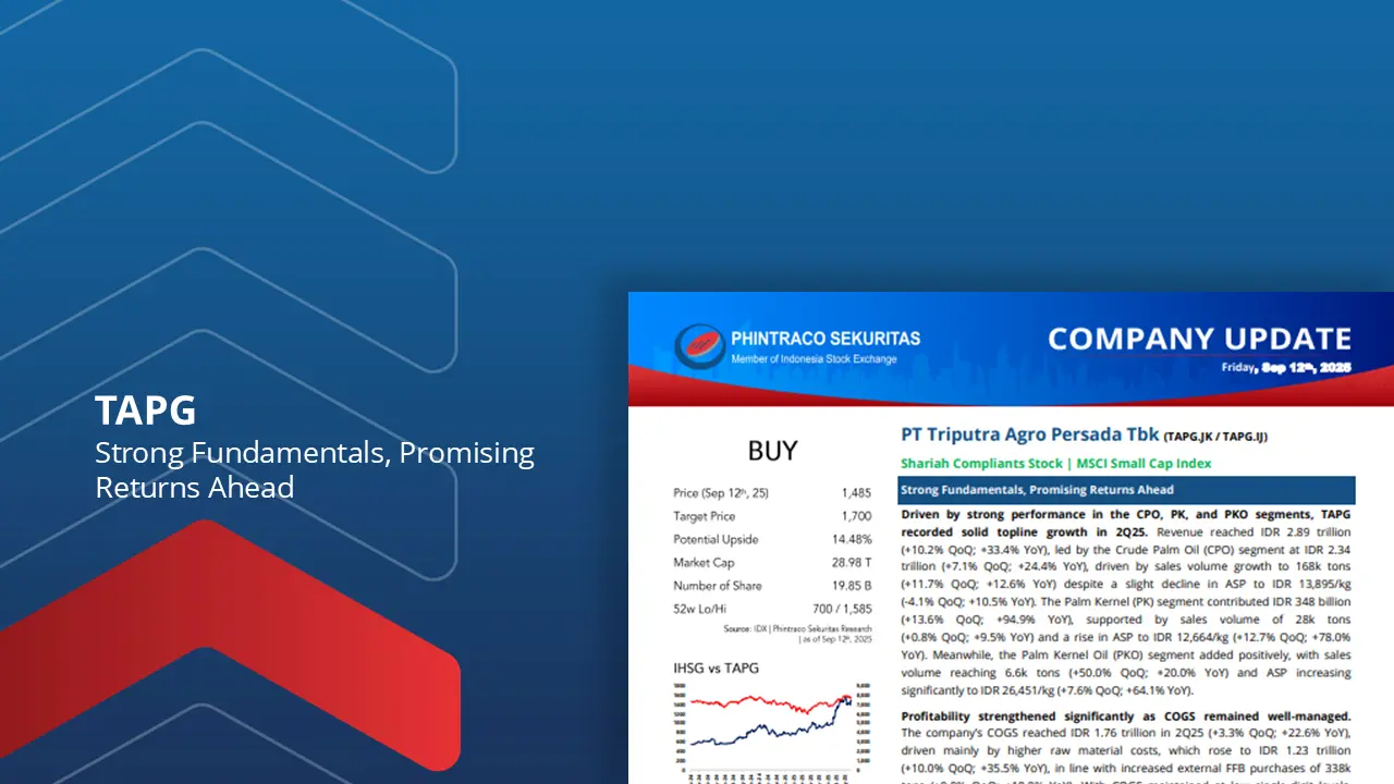 TAPG posted solid top-line growth in 2Q25, driven by strong performance in the CPO, PK, and PKO segments. Revenue reached IDR 2.89 trillion (+10.2% QoQ; +33.4% YoY), mainly from CPO at IDR 2.34 trillion (+7.1% QoQ; +24.4% YoY) with sales volume of 168k tons (+11.7% QoQ; +12.6% YoY) despite a slight ASP decline to IDR 13,895/kg (-4.1% QoQ; +10.5% YoY). The PK segment contributed IDR 348 billion (+13.6% QoQ; +94.9% YoY), while PKO also performed well with 6.6k tons (+50.0% QoQ; +20.0% YoY) and ASP rising to IDR 26,451/kg (+7.6% QoQ; +64.1% YoY).Profitability improved as COGS was well-managed, standing at IDR 1.76 trillion (+3.3% QoQ; +22.6% YoY), driven by higher raw material costs of IDR 1.23 trillion (+10.0% QoQ; +35.5% YoY) and external FFB purchases of 338k tons (+9.0% QoQ; +18.8% YoY). Gross profit reached IDR 1.12 trillion (+23.3% QoQ; +55.5% YoY), while net profit was IDR 889 billion (+10.4% QoQ; +49.3% YoY) with net margin improving to 30.8%. Earnings from associates of IDR 272 billion (+4.8% QoQ; +37.7% YoY) also supported the bottom line.TAPG 1H25 strong results prompt upward revisions: FY25F/FY26F revenue +4.8%/+7.3%, EBITDA +5.9%/+7.9%, NP +5.5%/+9.6%. CPO prices seen stable at MYR4,200–4,500/MT, while higher PK & PKO ASPs boost margins.We maintain our BUY recommendation with an increased target price of IDR 1,700/share, implying P/E of 9.2x/8.3x and P/BV of 2.8x/2.6x for FY25F/FY26F.We view TAPG as still attractive due to: (1) a relatively young plantation profile (blended age: 14.2 years) with stable productivity prospects, (2) a consistent dividend track record (DPR AVG-3Y: >50%), and (3) a healthy and solid balance sheet with DER <1xKey downside risks : (1) global CPO and edible oil price volatility, (2) unfavorable government regulations, and (3) weather disruptions affecting plantation productivity.By PHINTRACO SEKURITAS | Research -Disclaimer On-