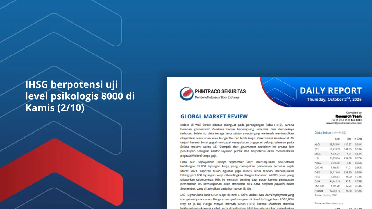 Indeks di Wall Street ditutup menguat pada Rabu (1/10).Sentimen positif berasal dari harapan government shutdown hanya berlangsung sebentar dan dampaknya terbatas.Data tenaga kerja sektor swasta yang melemah menimbulkan ekspektasi penurunan suku bunga The Fed lebih lanjut.Inflasi RI bulan September tercatat 2.65% YoY dari 2.31% YoY di Agustus 2025 dan di atas perkiraan 2.5% YoY.Indeks manufacturing PMI domestik bulan September 2025 turun di level 50.4 dari 51.5 di Agustus 2025.Neraca perdagangan bulan Agustus 2025 membukukan surplus USD5.49 miliar, naik dari USD4.18 miliar di Juli 2025.U.S. 10-year Bond Yield turun 4 bps di level 4.106%.Harga emas spot menguat di  level tertinggi baru US$3,866/troy oz (1/10), akibat government shutdown di AS.Diperkirakan IHSG berpotensi uji level psikologis 8000 pada perdagangan Kamis (2/10).Top picks (2/10) : UNVR, ANTM, JPFA, MAIN, dan PYFA.By PHINTRACO SEKURITAS | Research - Disclaimer On -