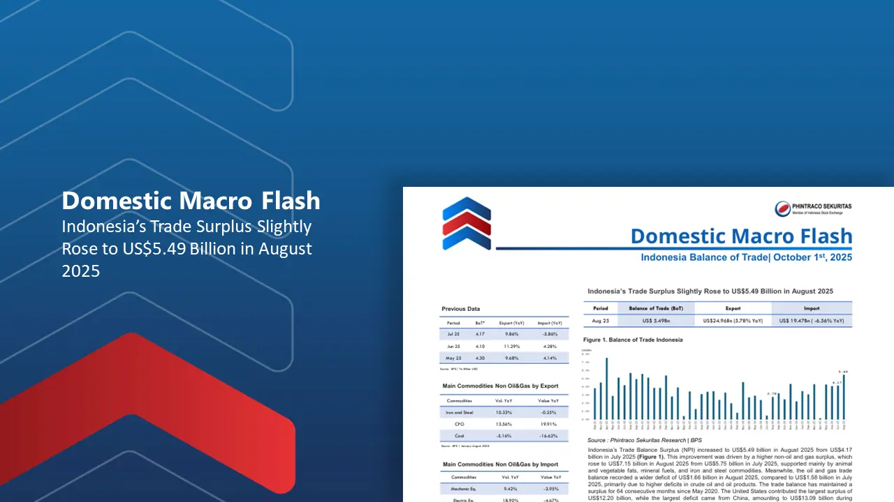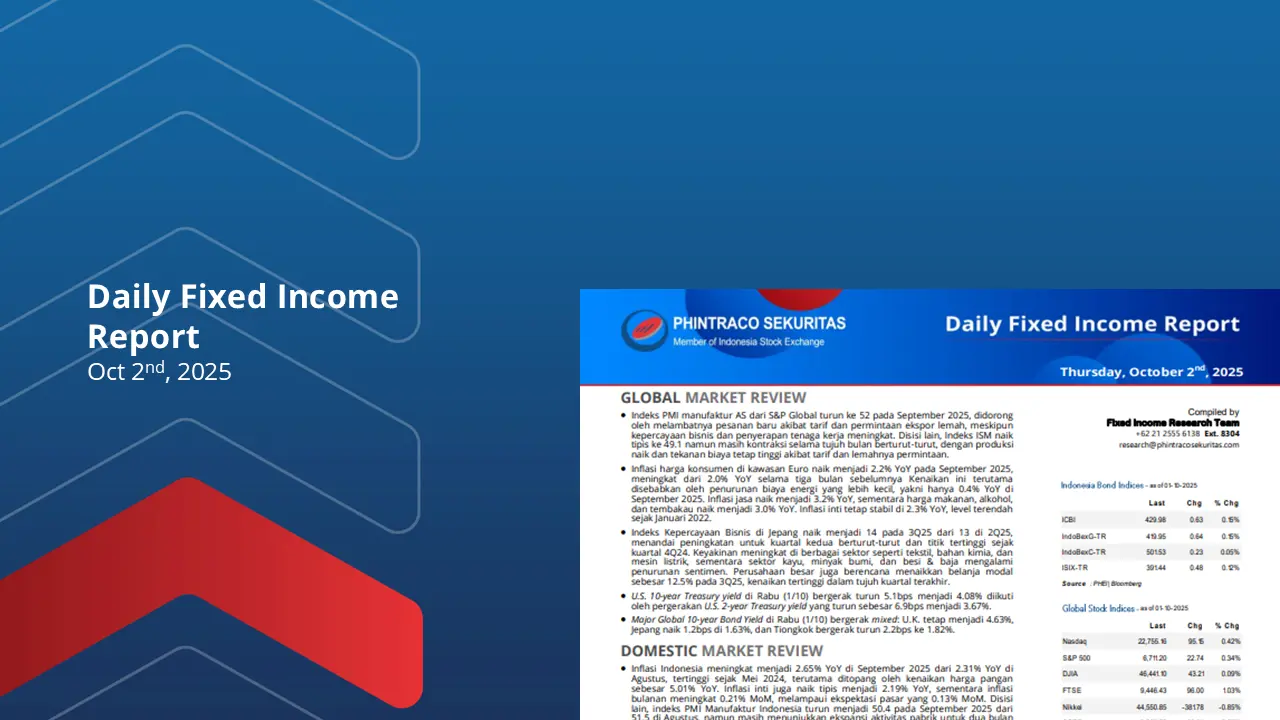 Indeks PMI manufaktur AS dari S&P Global turun ke 52 pada September 2025, didorong oleh melambatnya pesanan baru akibat tarif dan permintaan ekspor lemah, meskipun kepercayaan bisnis dan penyerapan tenaga kerja meningkat. Disisi lain, Indeks ISM naik tipis ke 49.1 namun masih kontraksi selama tujuh bulan berturut-turut, dengan produksi naik dan tekanan biaya tetap tinggi akibat tarif dan lemahnya permintaan.Inflasi Indonesia meningkat menjadi 2.65% YoY di September 2025 dari 2.31% YoY di Agustus, tertinggi sejak Mei 2024, terutama ditopang oleh kenaikan harga pangan sebesar 5.01% YoY. Inflasi inti juga naik tipis menjadi 2.19% YoY, sementara inflasi bulanan meningkat 0.21% MoM, melampaui ekspektasi pasar yang 0.13% MoM. Disisi lain, indeks PMI Manufaktur Indonesia turun menjadi 50.4 pada September 2025 dari 51.5 di Agustus, namun masih menunjukkan ekspansi aktivitas pabrik untuk dua bulan berturut-turut. Pesanan baru terus naik, sementara hasil produksi menurun akibat lemahnya daya beli pelanggan.