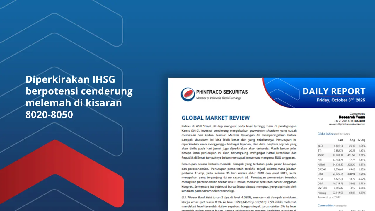 Indeks di Wall Street ditutup menguat pada rekor tertinggi baru di Kamis (2/10).Investor masih cenderung mengabaikan government shutdown yang memasuki hari kedua.Menteri Keuangan AS memperingatkan bahwa dampak shutdown ini bisa lebih besar dari yang sebelumnya.Rilis data nonfarm payrolls berpotensi tertunda.USD indeks melemah mendekati level terendah dalam sepekan (2/10).Harga minyak turun sekitar 2% ke level terendah dalam empat bulan, karena kekhawatiran tentang kelebihan pasokan di pasar menjelang pertemuan OPEC+ selama akhir pekan.U.S. 10-year Bond Yield turun 2 bps di level 4.088%.Harga emas spot turun 0.5% ke level US$3,845/troy oz (2/10).Diperkirakan IHSG berpotensi bergerak cenderung melemah di kisaran 8020-8050 pada perdagangan Jumat (3/10).Top picks (3/10) : TLKM, WIFI, RAJA, BUKA dan MAPI.By PHINTRACO SEKURITAS | Research - Disclaimer On -