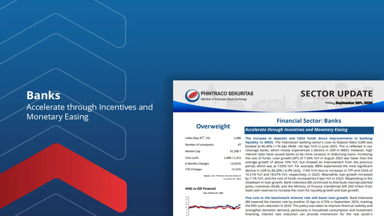 The increase in deposits and CASA funds drove improvements in banking liquidity in 6M25. The Indonesian banking sector's Loan to Deposit Ratio (LDR) was booked at 86.40% (-176 bps MoM; +65 bps YoY) in June 2025.Five cuts in the benchmark interest rate will boost loan growth. Bank Indonesia (BI) lowered the interest rate by another 25 bps to 4.75% in September 2025, marking the fifth such reduction in 2025.Asset quality improvements have the potential to continue in the 2H25. Non Performing Loan ratio (NPL) remained stable at 2.17%, down 60 bps YoY and 60 bps MoM in June 2025.The Macroprudential Liquidity Policy, along with the transfer of IDR 200 trillion from the state budget to Himbara, has the potential to increase banking liquidity.The trend in Islamic financing distribution in Indonesia shows positive growth, with total Islamic banking assets reaching nearly IDR 967 trillion in June 2025, and Islamic financing growing 8.38% YoY compared to conventional bank loan growth of +7.77% YoY in June 2025.In line with these developments, conventional banks are currently starting to spin off Sharia Business Units in accordance with the provisions of POJK Number 12 of 2023.The banks under our coverage booked mixed performances. BRIS, which booked loan growth (+23.97% YoY), ROE (+40 bps), and net profit (+10.21% YoY) in 6M25. BBCA also booked loan growth (+12.9% YoY), ROE (+40 bps), and net profit (+8.0% YoY) in 6M25. Meanwhile, BBRI, BMRI, and BBNI booked 6M25 performance below our expectations.With the various catalysts above, as well as the performance of each bank in the banking sector, we make our top picks BRIS with a potential fair value of Rp3,580 and BBCA with a potential fair value of Rp11,400.By PHINTRACO SEKURITAS | Research - Disclaimer On -