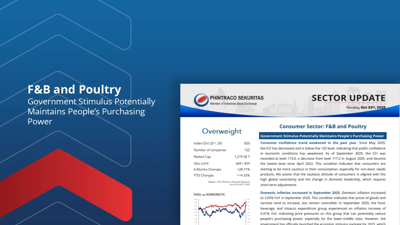 With the various catalysts above, we maintain our overweight rating on the F&B and Poultry sectors. Our top picks are INDF, with an estimated fair value of IDR9,650, and JPFA, with an estimated fair value of IDR2,720.